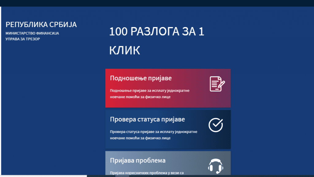 Ministarstvo finansija je saopštilo da se u prvih pet sati, od momenta kada je omogućena prijava na portalu Uprave za trezor na web adresi idp.trezor.gov.rs, milion građana Srbije prijavilo za isplatu novčane pomoći u iznosu od 100 evra.