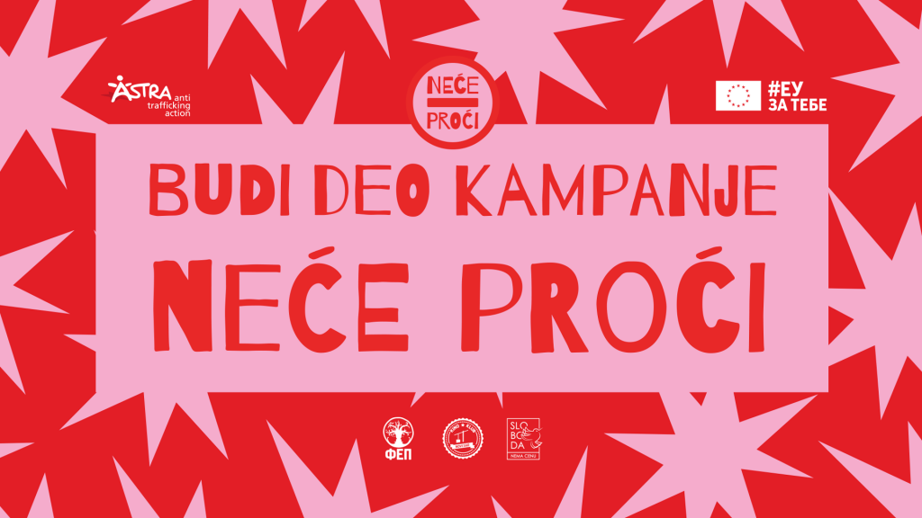 Organizatori pozivaju mlade da se priključe kampanji i da kroz svoje društvene mreže i njima vrlo poznate sadržaje – muziku, slikarstvo, književnost, pa i modernije vidove kulture kakvi su internet mimovi, jutjub klipovi i slično, obrade fenomen trafikinga i putem demistifikacije i kreativne analize pošalju poruku da to – NEĆE PROĆI!