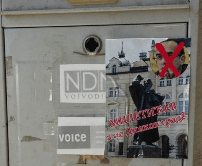 Na nalepnici je spomenik Svetozaru Miletiću u Novom Sadu, precrtan lik programskog direktora NDNV-a Dinka Gruhonjića i ispisano “Miletićev, a ne Dinkov grad”.