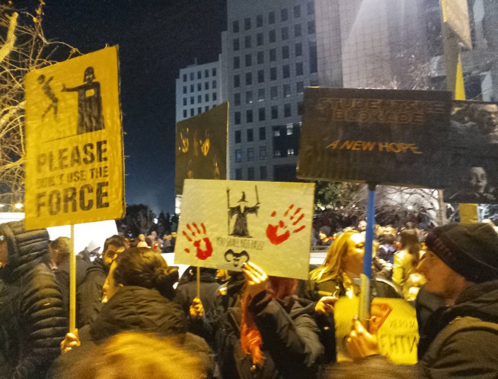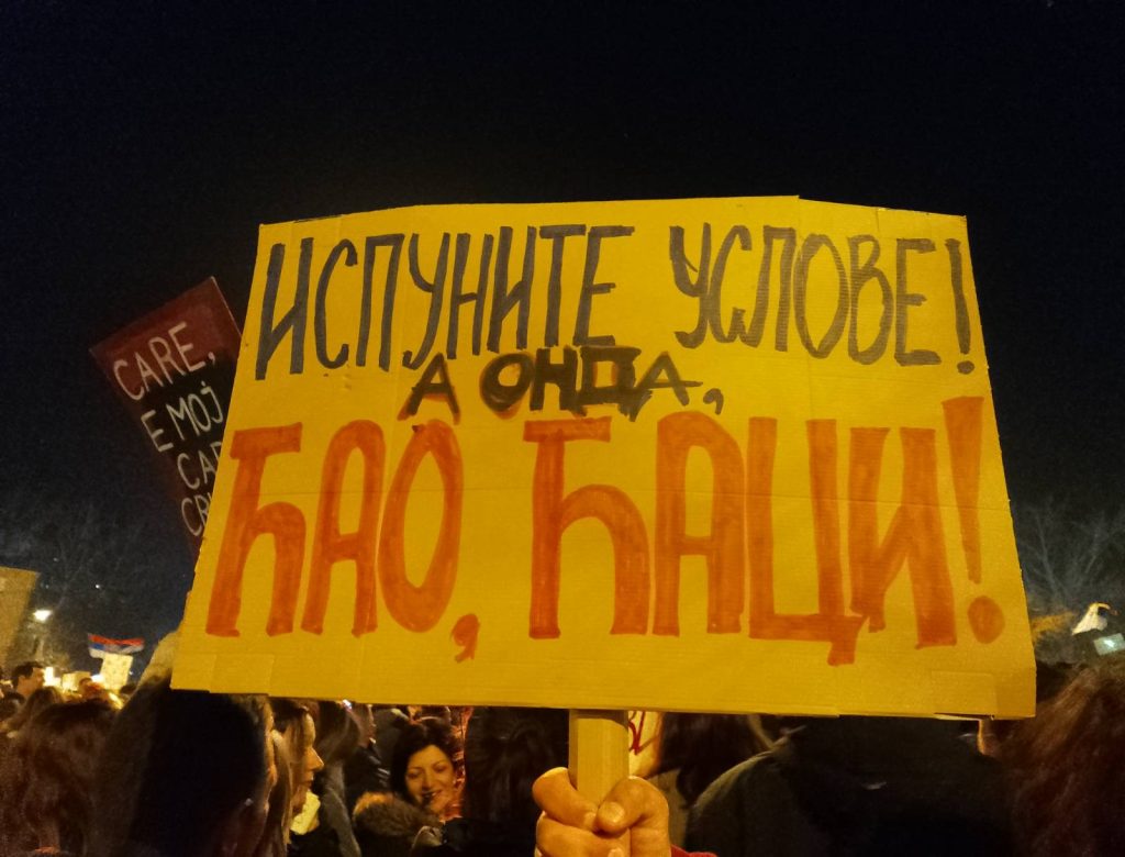“Svi zajedno ćemo ostati na mostovima, na ulicama dokle god bude potrebno, jer ovaj grad i ova zemlja pripadaju svima nama jer želimo da ostanemo u našoj državi Srbiji. Hvala vam što zajedno pišemo istoriju. Više ne ćutimo nikome, nikada više, ni za šta”, poručila je studentkinja sa govornice ispred zgrade Naftne industrije Srbije, u blizini blokiranog Mosta slobode, gde su se okupile desetine hiljada ljudi na studentskom protestu.