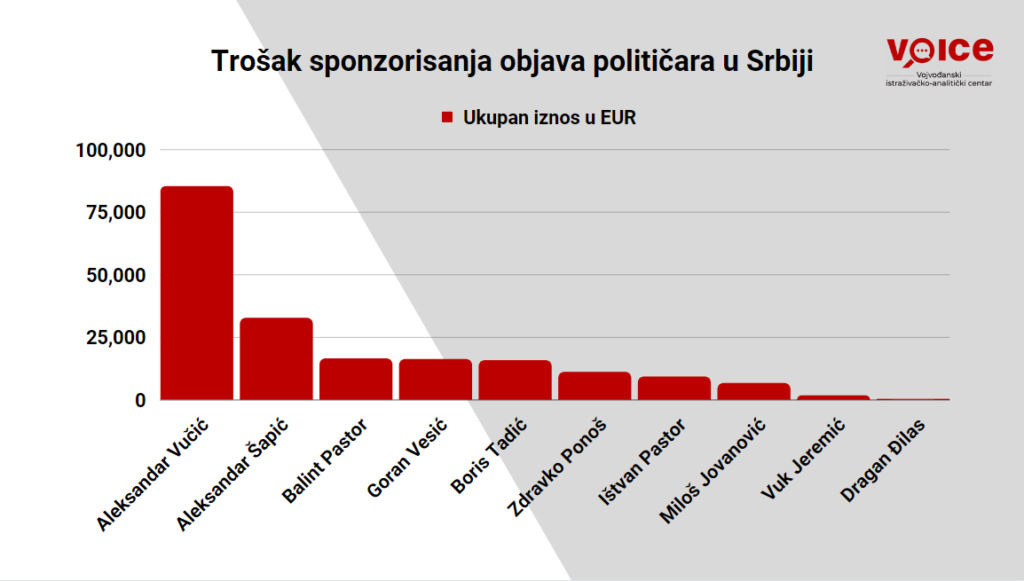Gledano po stranicama političara, najviše je potrošeno na sponzorisanje objava Aleksandra Vučića. Kada se pogleda, vidi se da je ukupan trošak 85.336 evra, od čega su ili on sam ili administratori njegovih stranica na Fejsbuku ili Instagramu platili 40.808 evra, dok je 44.528 platila Srpska napredna stranka.
