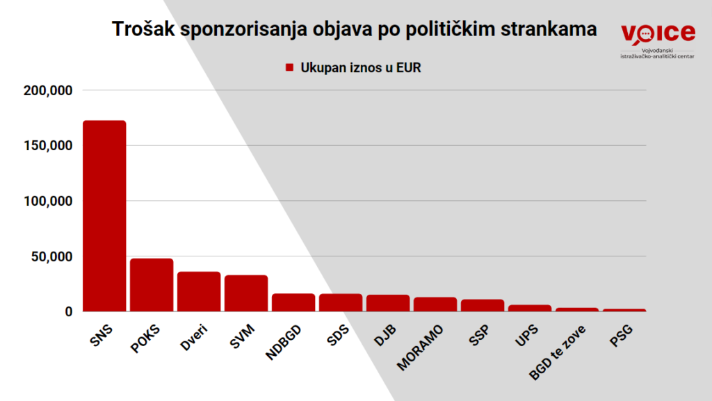 Istraživanje koje je sproveo VOICE pokazalo je da je u te svrhe potrošeno gotovo 1,4 miliona evra za nešto više od 45.000 reklama, to jest, sponzorisanih sadržaja za period od avgusta 2020. godine do sredine novembra. S tim da je, kada se pogleda pojedinačno, taj period i duži, seže sve do juna 2019. godine, ali nije reč samo o “postovima” političara i stranaka, već su iskazani i podaci o sponzorisanim sadržajima medija i drugih organizacija koje su povezane sa društvenim pitanjima, izborima ili politikom.